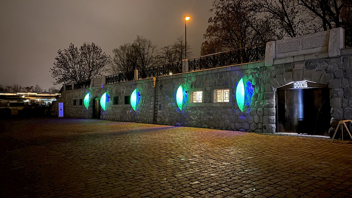 Die leuchtenden Boote sind aus Drahtgitter gebogen und verschweißt, mit fluoreszierender Farbe angesprüht und mit Schwarzlichtlampen beleuchtet.
