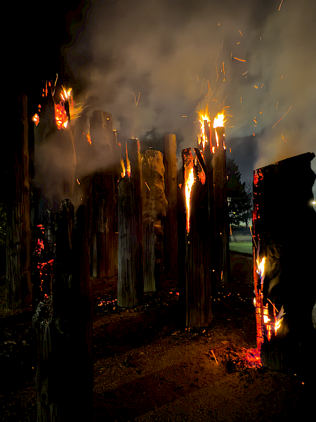 Die Installation Klangschwellen besteht aus 3 Elementen. Jedes Element besteht aus einem Türrahmen aus Rundstahl, an dessen oberer Traverse ein verkohlter und ausgehöhlter Stamm hängt. Der Stamm gibt beim Anschlagen mit einem Schlegel einen Klang ab. Dumpf, düster und bedrohlich.